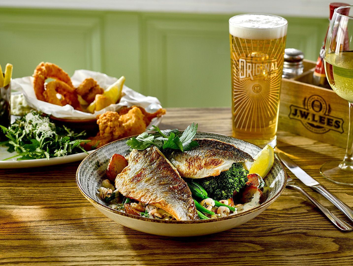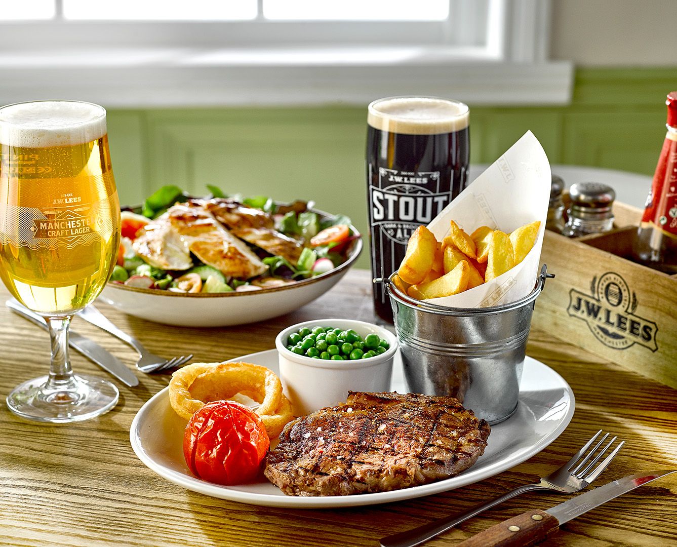Pull up a chair with our new Spring dishes in Alkrington. Proper tasty pub grub for warm days and cold pints with friends and family. Made for pairing with our Manchester-made beers, our spring and summer dishes include new seasonal salads, fish dishes, succulent grills and more. Not forgetting your pub favourites like our legendary cheese & onion pie, John Willie’s beer battered fish and the iconic Brewery tower burger (none are bigger).